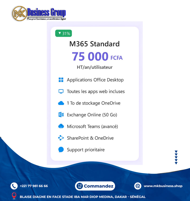 ⚙️ Microsoft 365 Business Standard — 75 000 FCFA / an / utilisateur